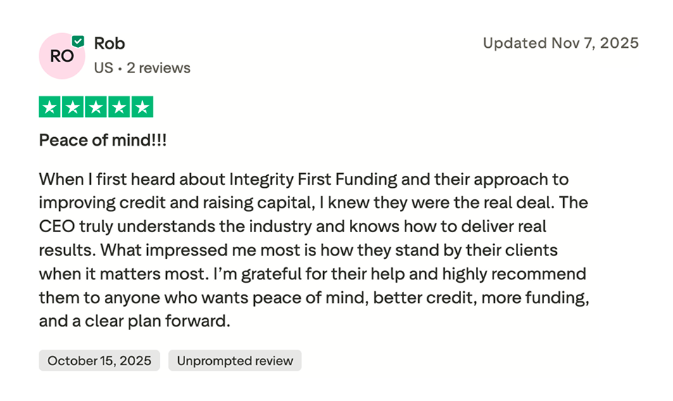 Disclaimer: Integrity First is not the lender, we are a consulting company that helps clients prepare and apply for funding with banks and private lenders. Funding is in form of business credit and must be repaid. We don’t guarantee approvals or terms of financing. Any guarantee offered applies only to our consulting fee.