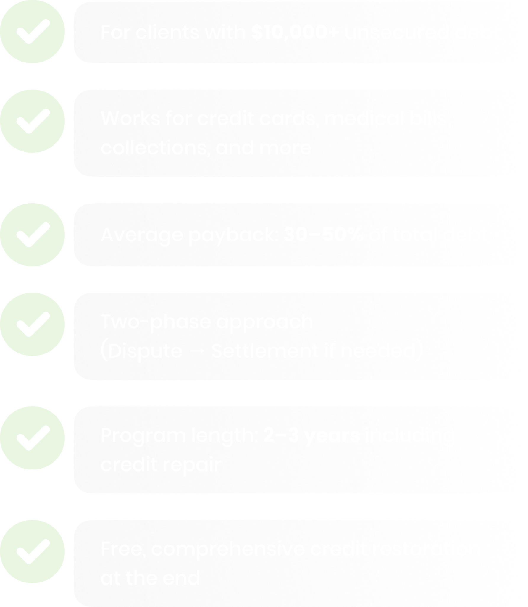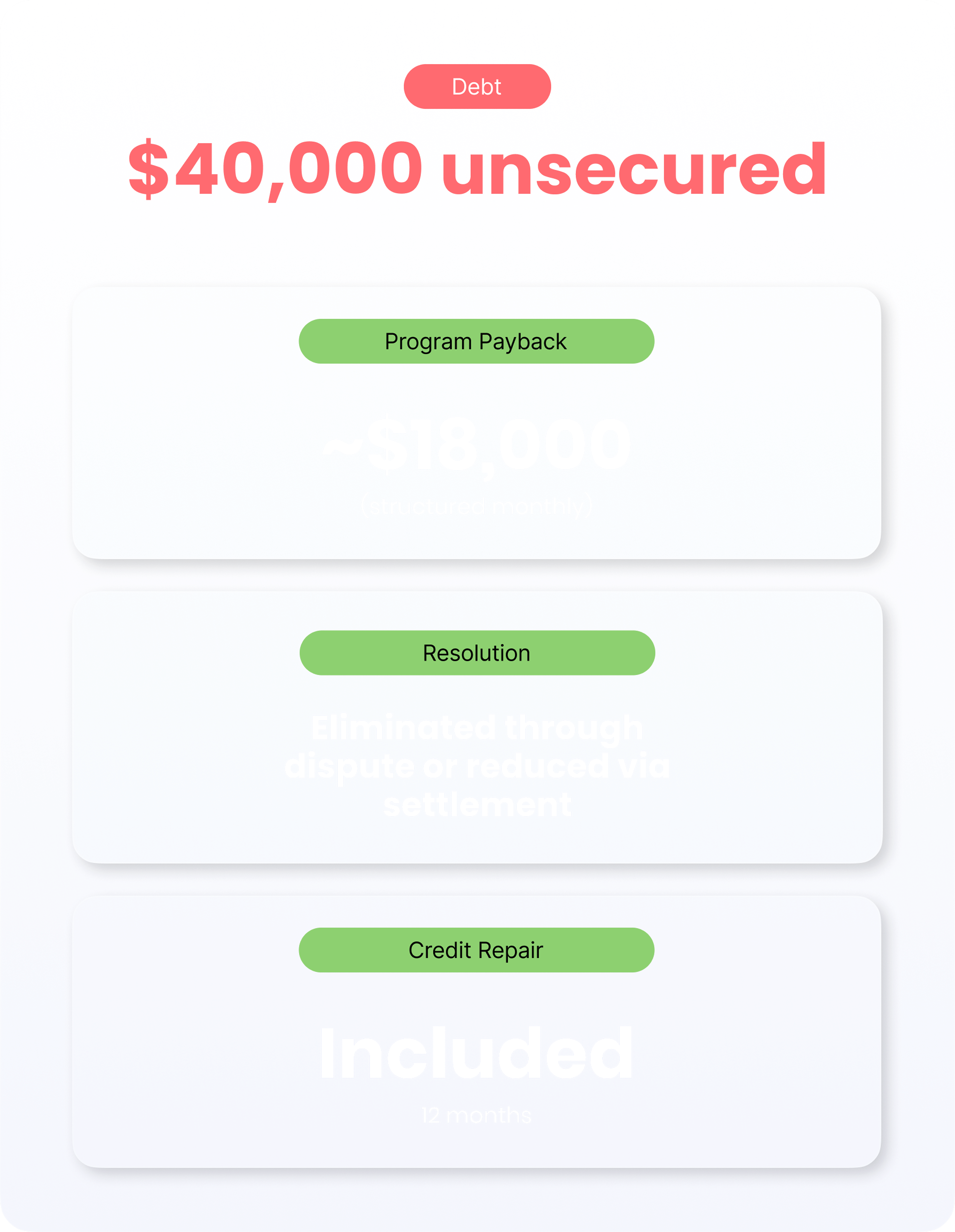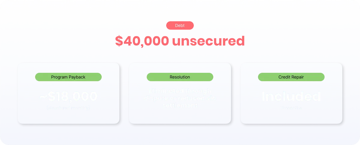 Most clients pay back only ~30–50% of their total unsecured debt.